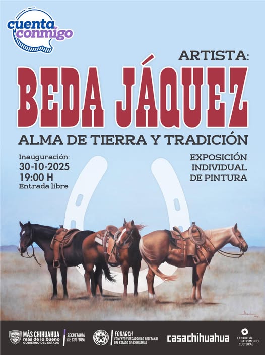 Beda Jáquez se distingue por plasmar en el lienzo las más cautivadoras imágenes del mundo vaquero. Con una trayectoria de más de 30 años, ha presentado una gran diversidad de colecciones y participado en innumerables exposiciones. Entre ellas destacan su presencia en la EXPOGAN Chihuahua desde 1988, en la Quinta Gameros en 2010, así como en muestras internacionales en Lubbock, Texas.